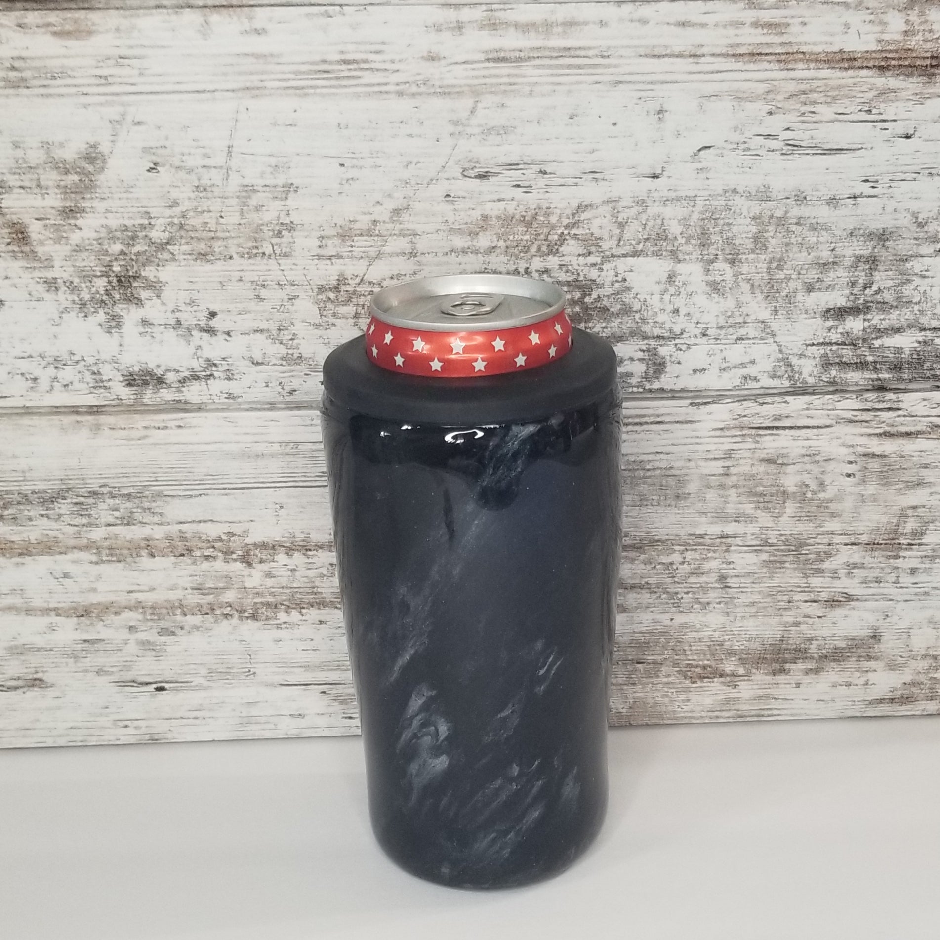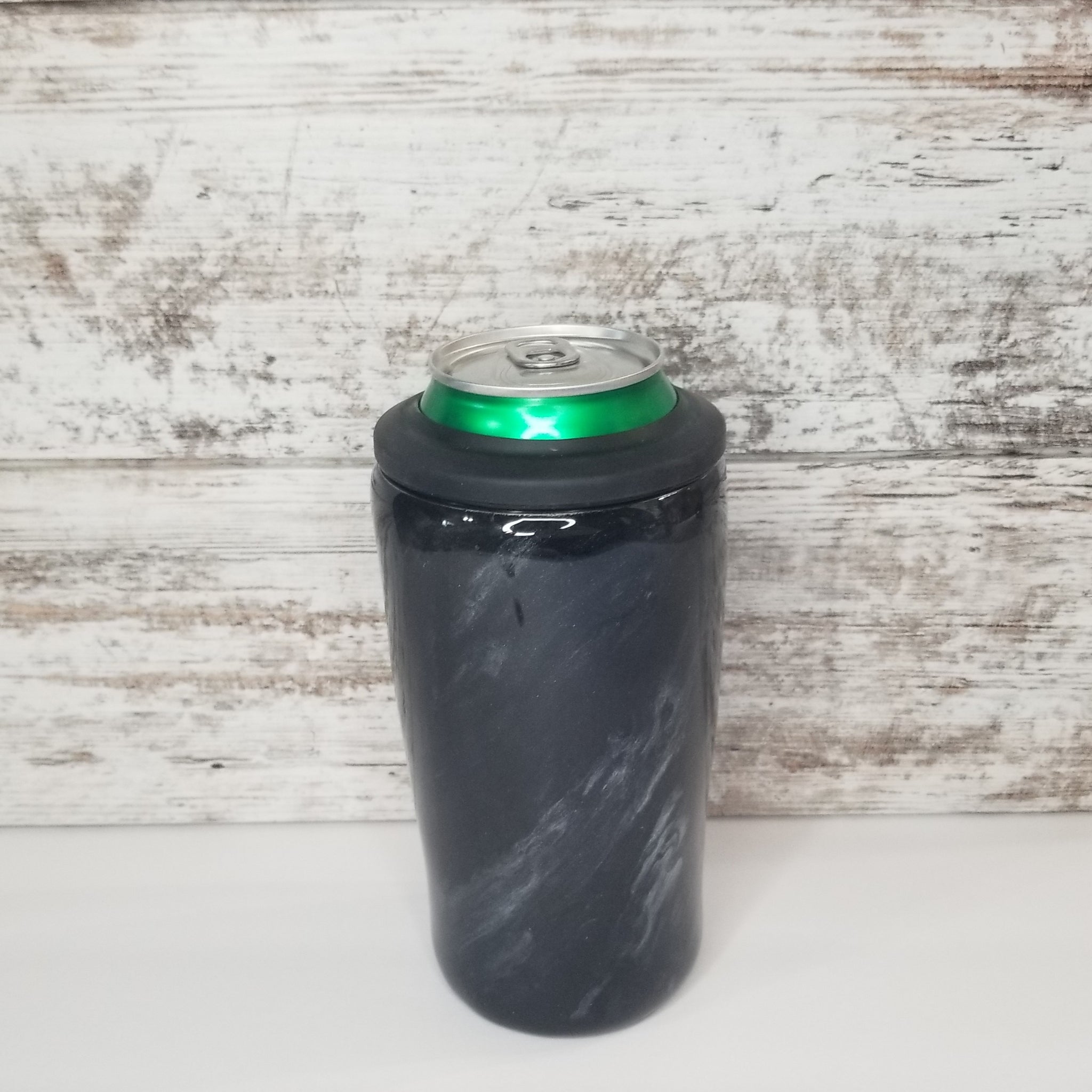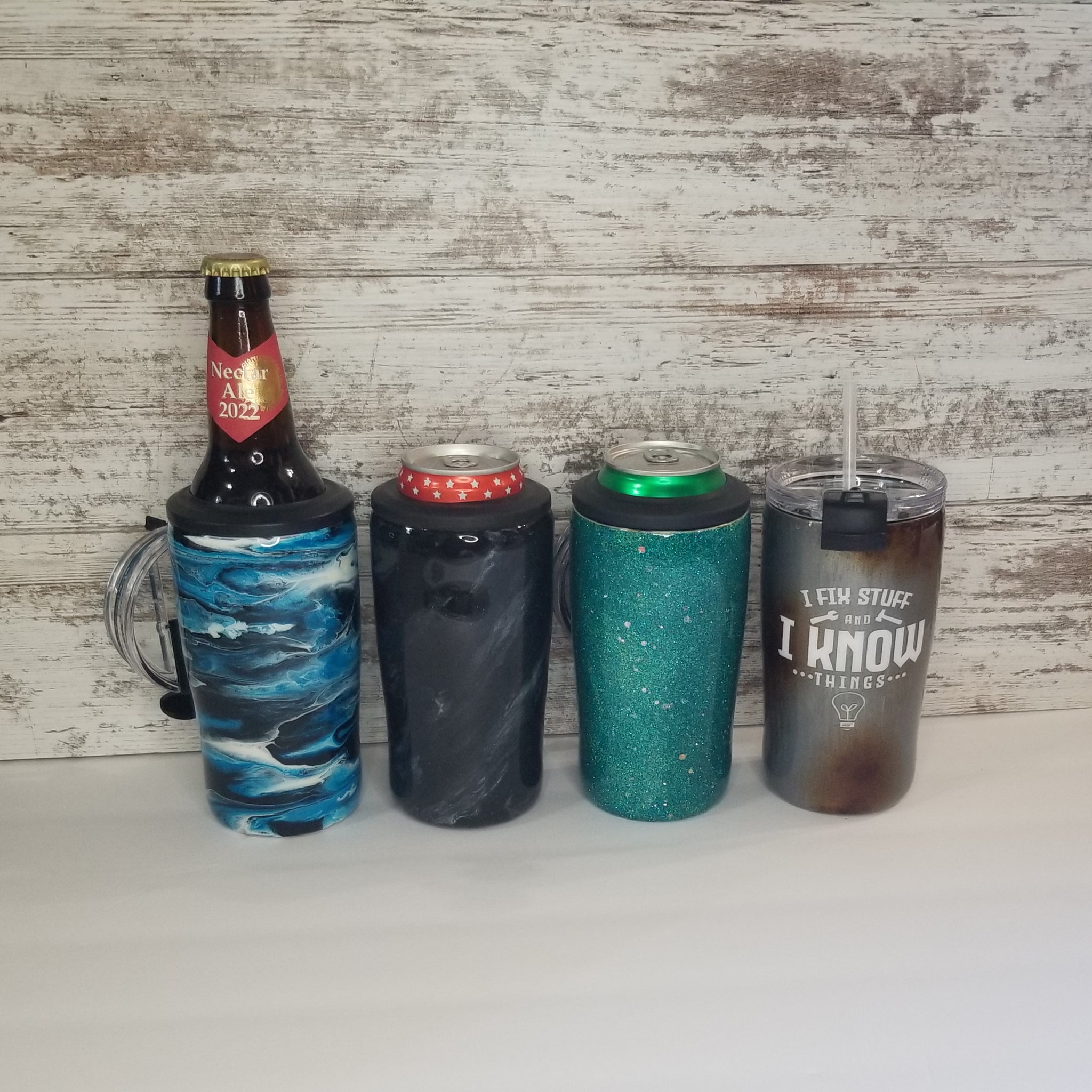 This Can cooler can hold regular 12 oz cans, 12 oz bottles, and skinny cans. (12 oz pop bottles also fit) It also comes with a flip top lid so it can be used at a 14 oz tumbler!