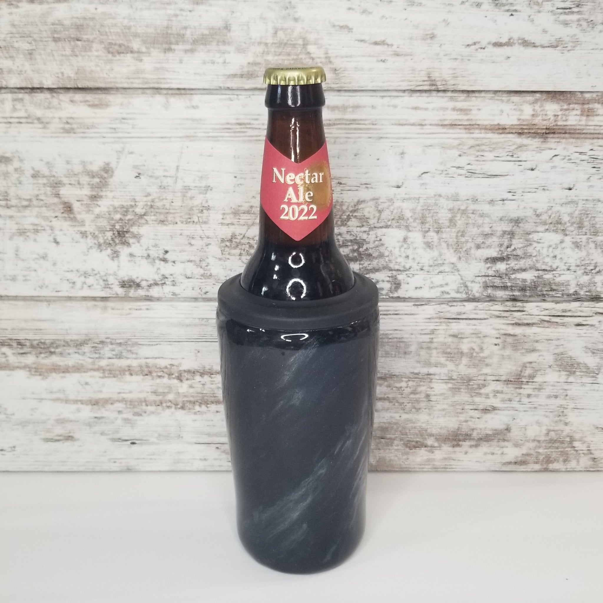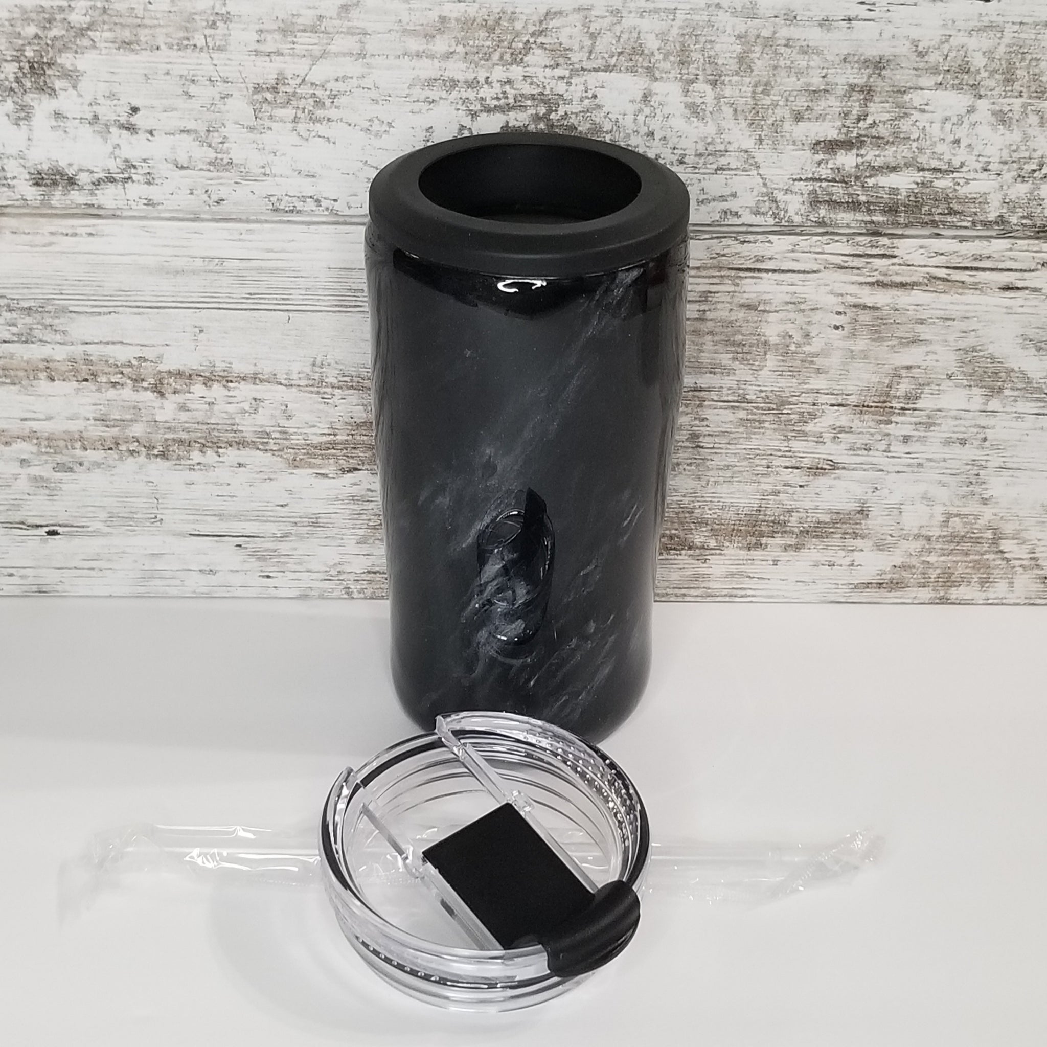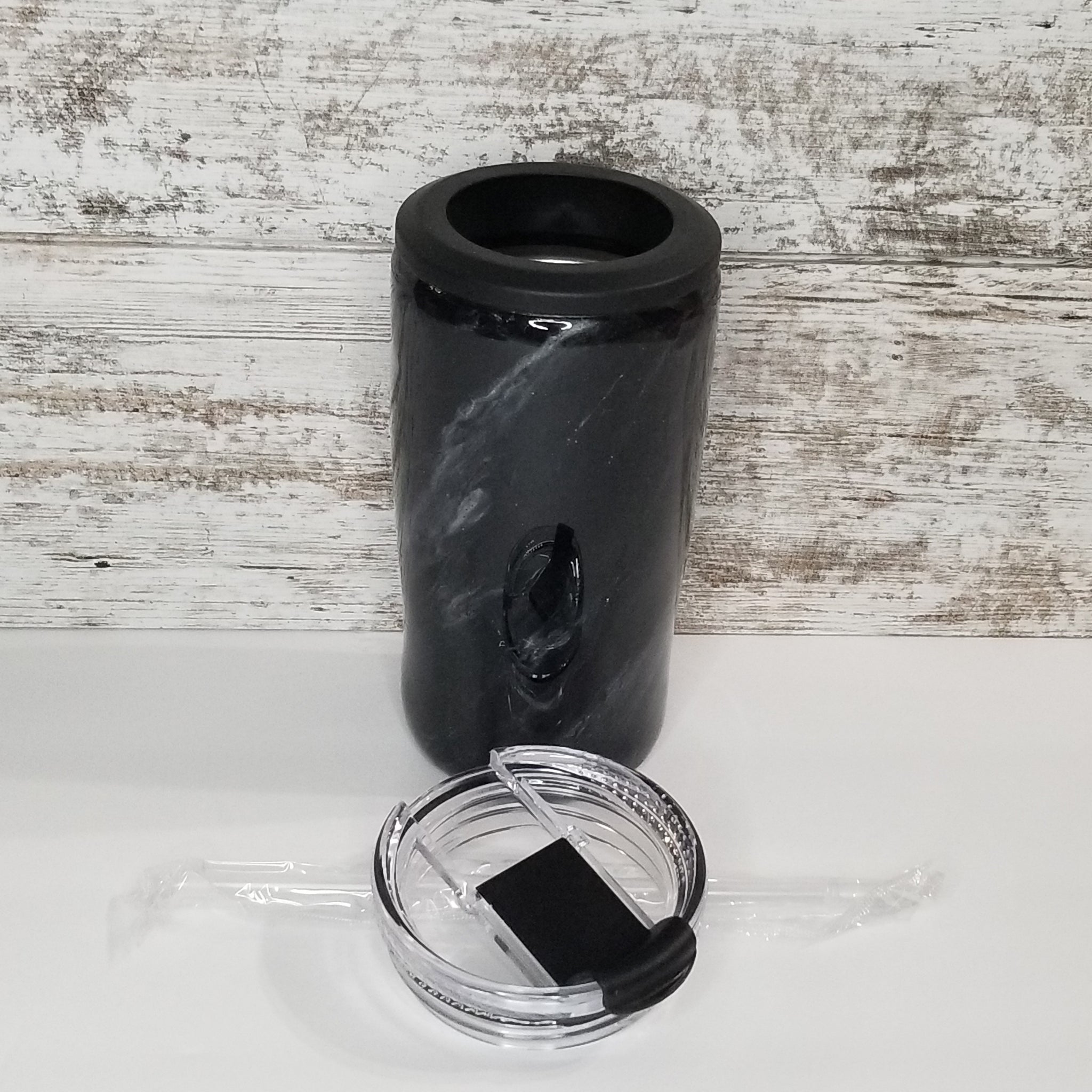 This Can cooler can hold regular 12 oz cans, 12 oz bottles, and skinny cans. (12 oz pop bottles also fit) It also comes with a flip top lid so it can be used at a 14 oz tumbler!