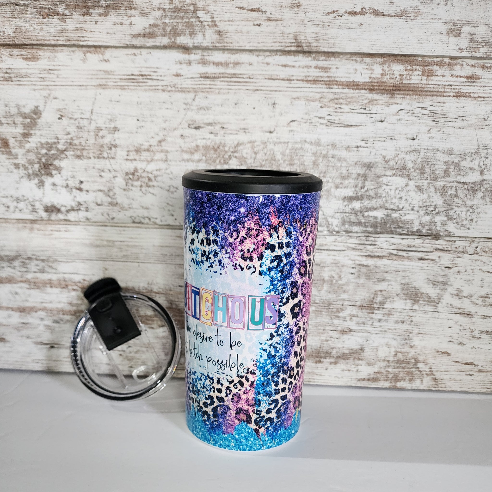 Hot and cold stainless steel cup. Comes with a flip top lid with a straw and can cooler attachment.