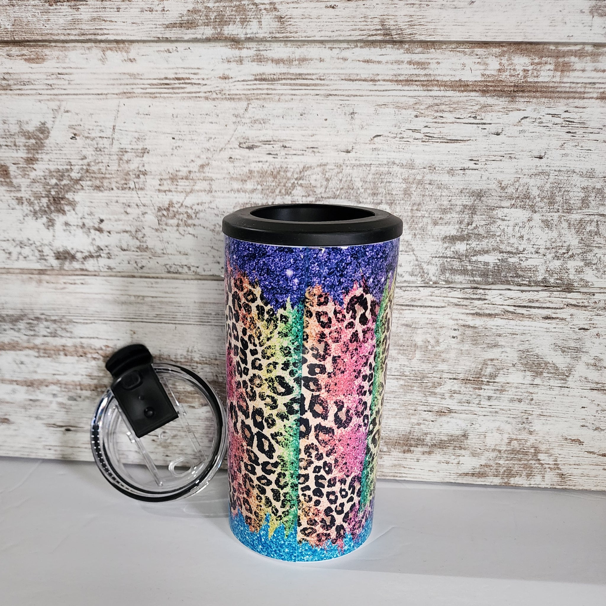This Can cooler can hold regular 12 oz cans, 12 oz bottles, and skinny cans. (12 oz pop bottles also fit) It also comes with a flip top lid so it can be used at a 14 oz tumbler. They also have a can opener on the bottom!