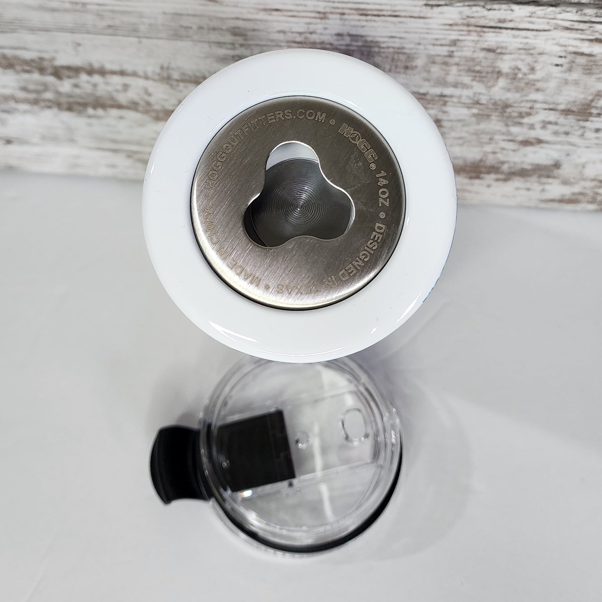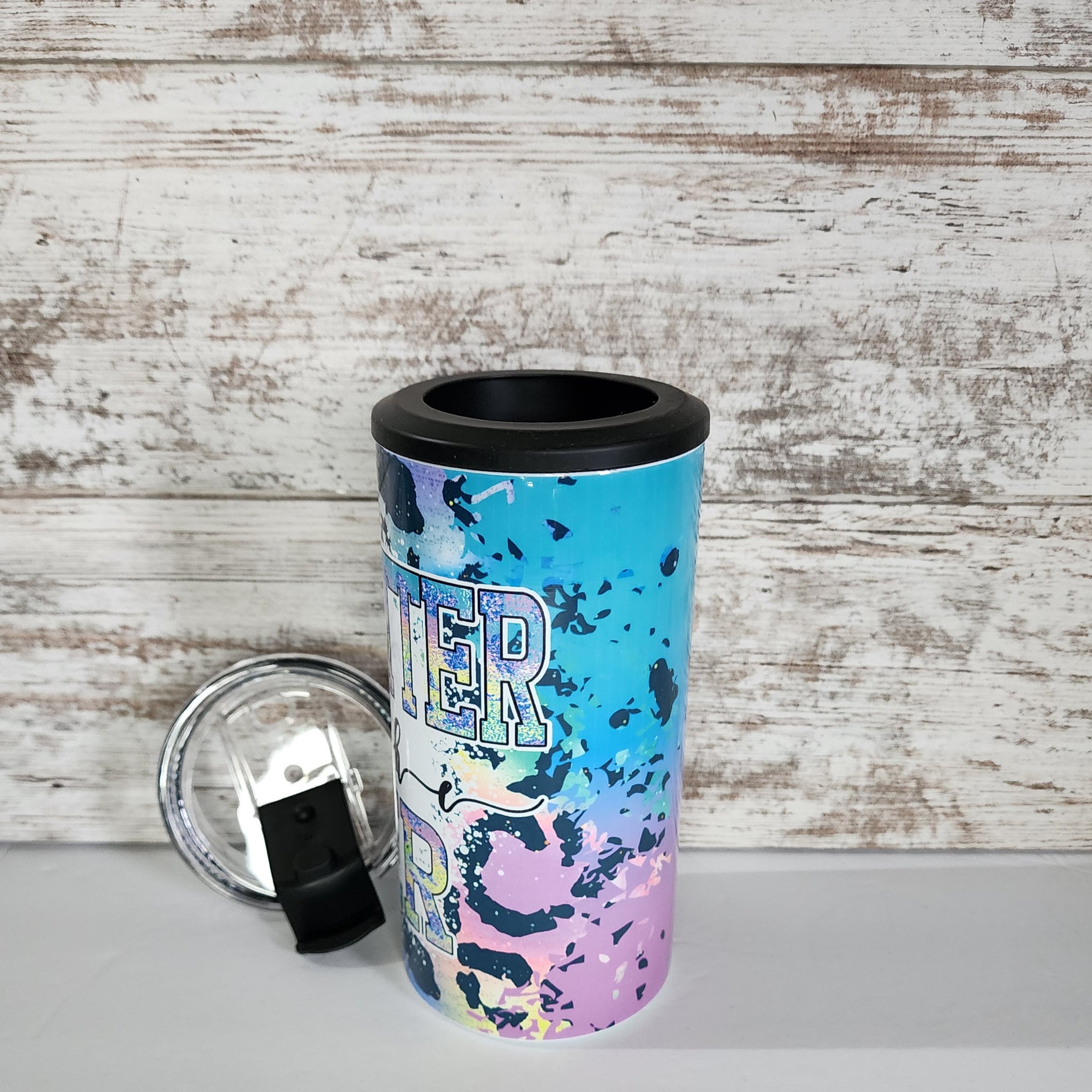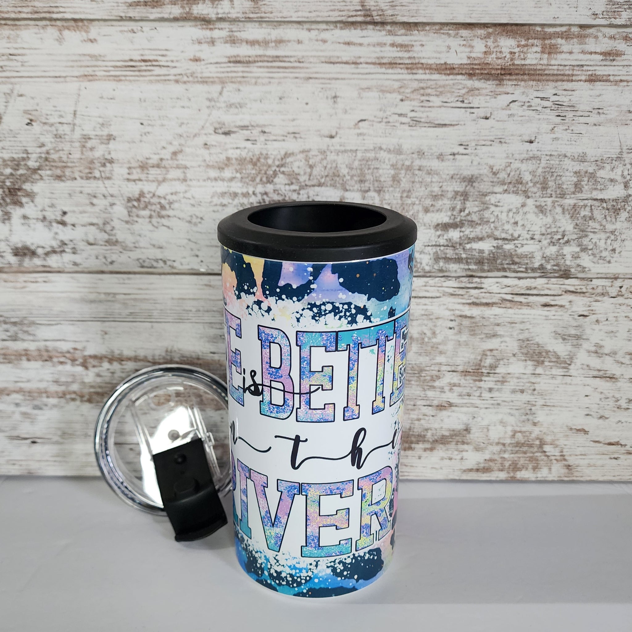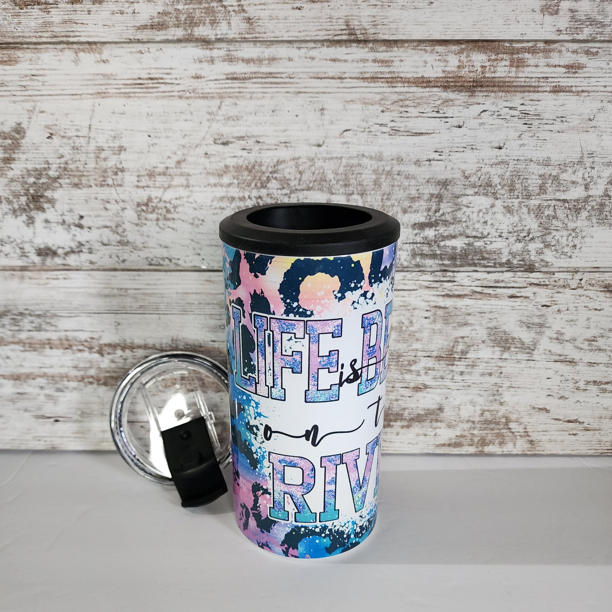 Hot and cold stainless steel cup. Comes with a flip top lid with a straw and can cooler attachment.